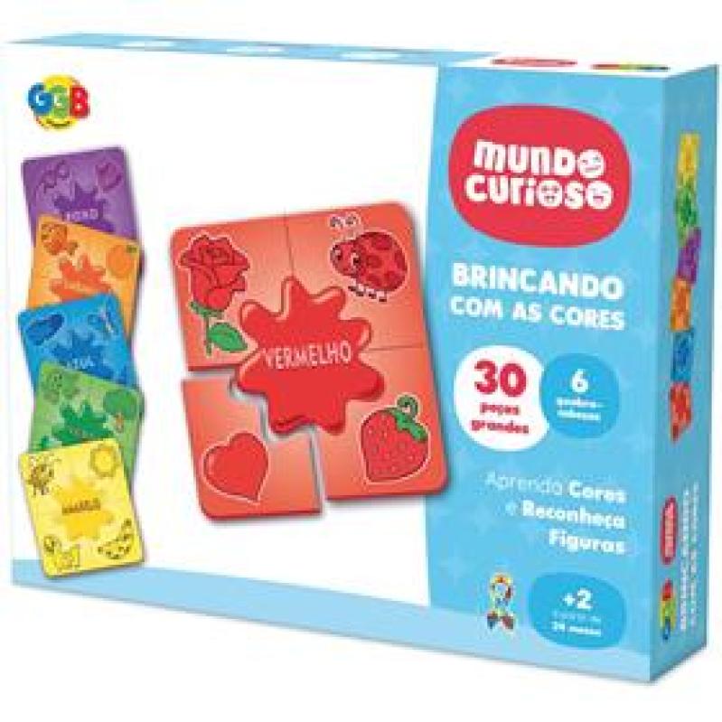 Jogo Brincando com as Cores - Mundo Curioso GGB O Brincando com as Cores e um jogo educativo perfeito para introduzir as primeiras nocoes de associacao e logica para os pequenos. Com pecas grandes e coloridas, ele torna o aprendizado visual e divertido! • Conteudo: 30 pecas grandes, divididas em 6 conjuntos de cores diferentes para montar. • Idade Recomendada: +2 anos. • Objetivo: Estimular o aprendizado das cores e o reconhecimento de figuras e objetos do cotidiano. • Desenvolvimento: Auxilia na coordenacao motora, raciocinio logico e percepcao visual.