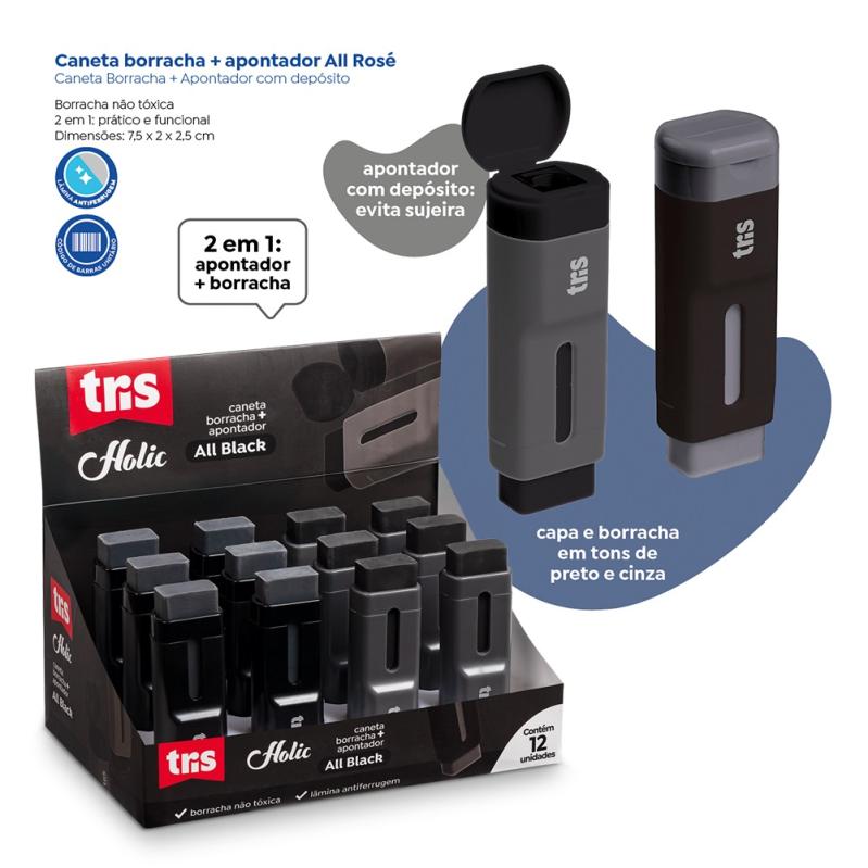 A coleção All Black apresenta itens sóbrios e elegantes que vão cativar os apaixonados por papelaria com um pretinho nada básico! A caneta borracha + apontador All Black com depósito é 2 em 1, trazendo muita praticidade para o dia-a-dia. Sua borracha é não tóxica e o apontador tem lâmina antiferrugem.
