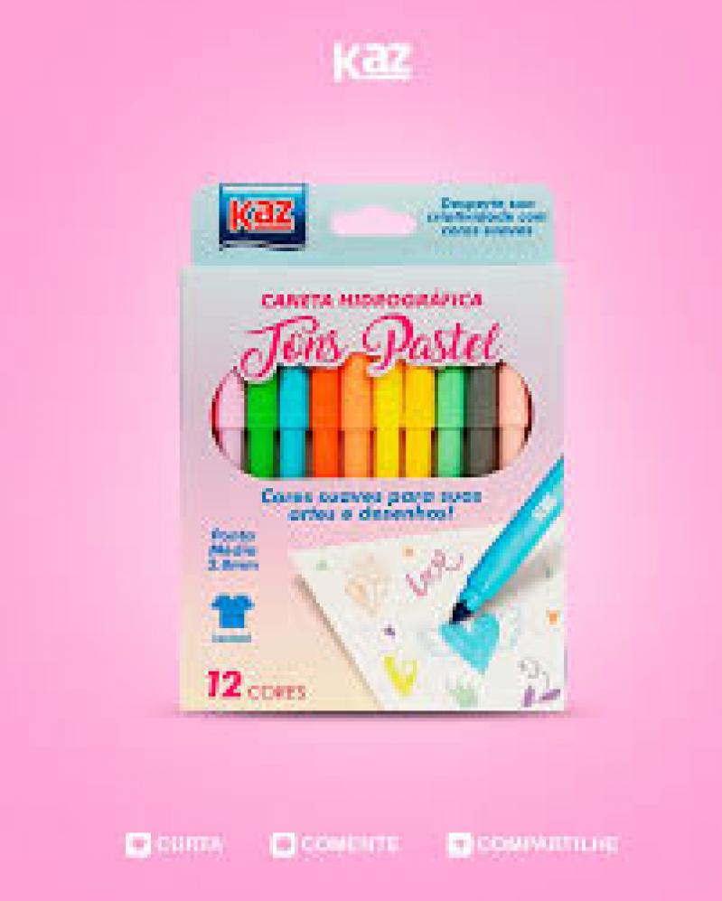 Características Técniuca> A Caneta Hidrográfica Kaz, é ideal para desenhar, pintar e trabalhos escolares. Tinta kavável com ponta média de 2mm, tampa anti-asfixante e cores pastel.
