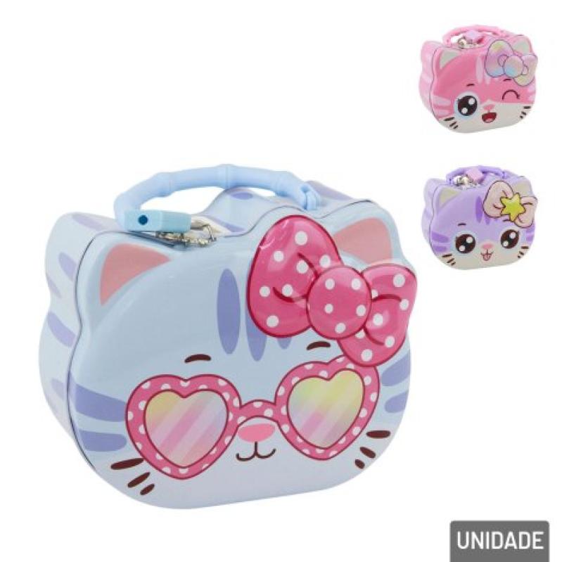 Cofre de Metal Infantil com alça, medindo 14x12cm, no formato divertido de gatinho, disponível em cores e estampas sortidas. Conta com cadeado seguro e duas chaves, garantindo proteção extra para as economias das crianças.