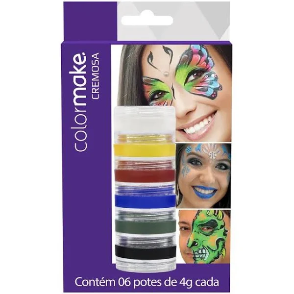 Pintura Facial Cremosa 6 Cores Colormake A Tinta Cremosa Facial possui textura macia com longa duração na pele e maior resistência à transpiração.Para selar o produto, recomenda-se o pó translúcido Colormake ou glitter em pó Colormake. Pode ser removida com o demaquilante Colormake ou águ a e sabonete. Cartela com 6 potes (4g cada) que se encaixam uns aos outros. Cores: vermelho, amarelo, azul, preto, branco e verde.Menos