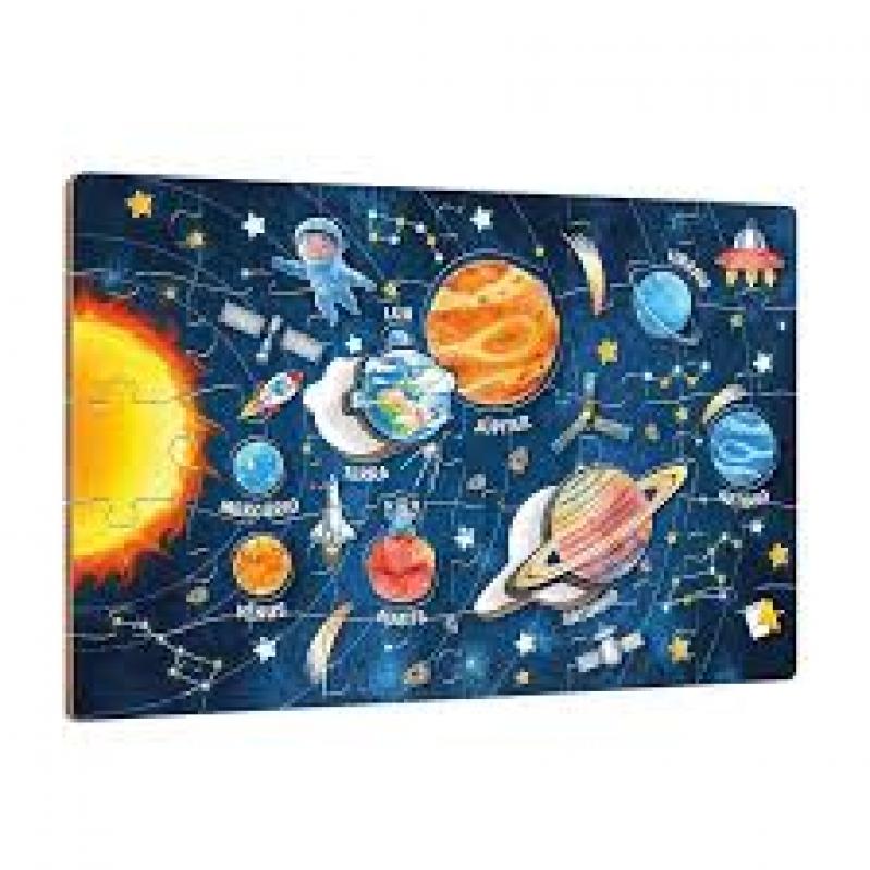 O " Quebra-Cabeca Viagem ao Espaco" com 38 pecas em MDF, com encaixe organico, e uma maneira divertida e educativa de desenvolver o raciocinio logico, a percepcao visual e a atencao. As pecas que representam os planetas sao inteiras, o que facilita sua visualizacao e torna a montagem mais intuitiva, incentivando a criatividade das criancas a partir de 4 anos!